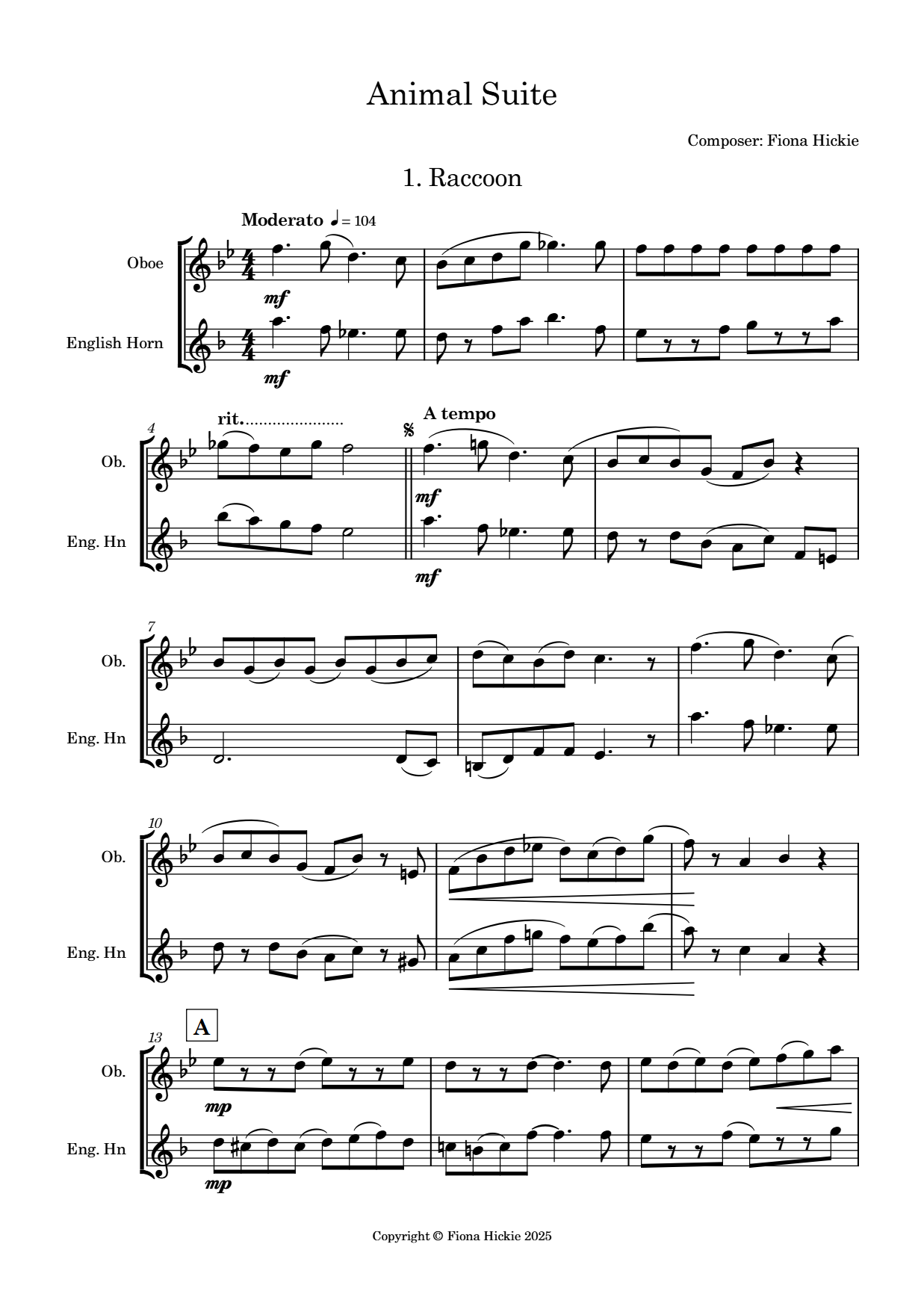 Animal Suite is a suite of 5 contrasting pieces for oboe and English horn duet about some of natures animals.