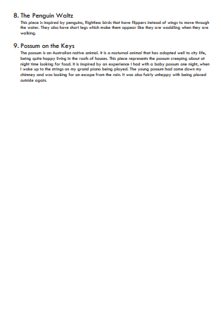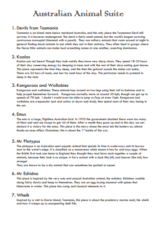 A suite of pieces inspired by Australian native animals. The music has contrasting styles and of varying difficulty. It includes: