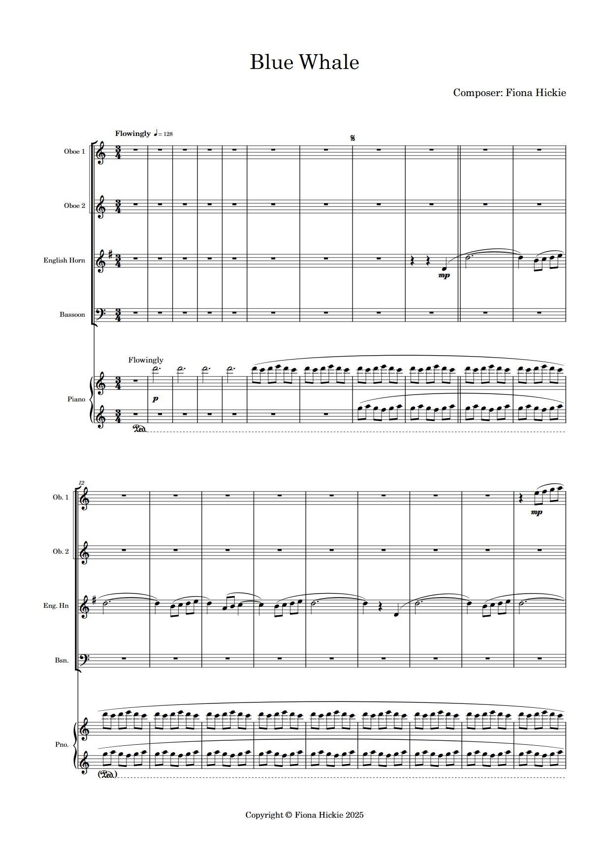 A beautiful piece of music dedicated to the blue whale. It is written for double reed quartet and piano. Gentle giants beneath the sea, Is it you I see floating free? Keep safe and well for ever more, Swimming freely between distant shores.