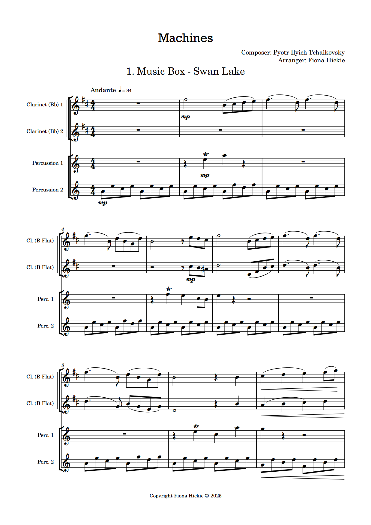 - Percussion 1: Glockenspiel, Guiro, Snare Drum, Ratchet and Whistle