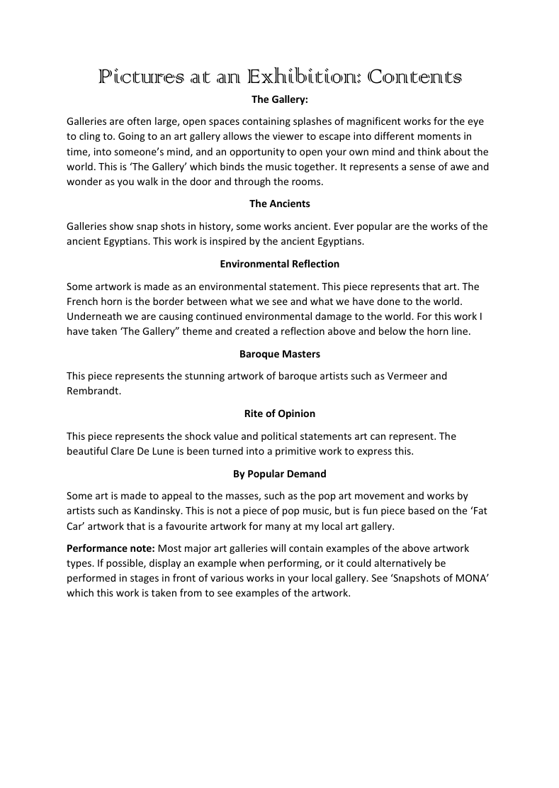 A new version of Pictures of an Exhibition that reflects on what art galleries are like today. Why not take your audiences for a walk through the art gallery.