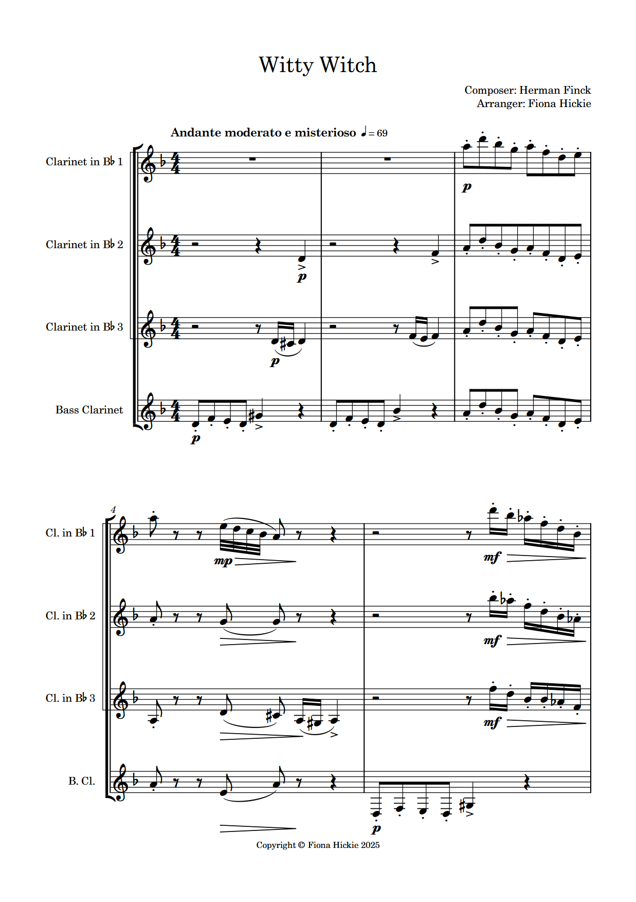 'Witty Witch' was originally part of Finck's '6 Humorisms for Photoplay Orchestra'. Photoplay music was intended to accompany silent films. This piece is full of sneaky themes.